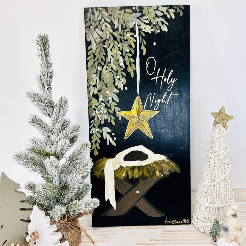 Celebrate the beauty of the season with this handcrafted O Holy Night sign, designed to bring a peaceful, Christ-centered touch to your holiday décor. At the top, hand-painted leaves add soft, natural detail, while a simple manger scene at the bottom grounds the piece in the heart of the Christmas story. The words O Holy Night are written in shimmering gold at the center right, catching the light and adding a gentle, elegant glow.